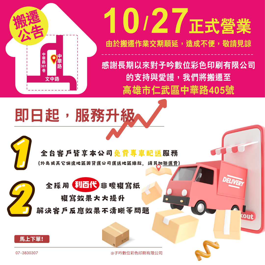 光復連假10/24(五)~10/26(日) 連休三日 若需印刷請盡早傳檔,休假期間暫停印刷、審稿、出貨及客服等相關服務。 網路收檔不間斷,客戶可傳檔案至信箱, 均將延至上班日盡速依序處理,造成不便尚請見諒! 子吟印刷 預祝您佳節愉快!